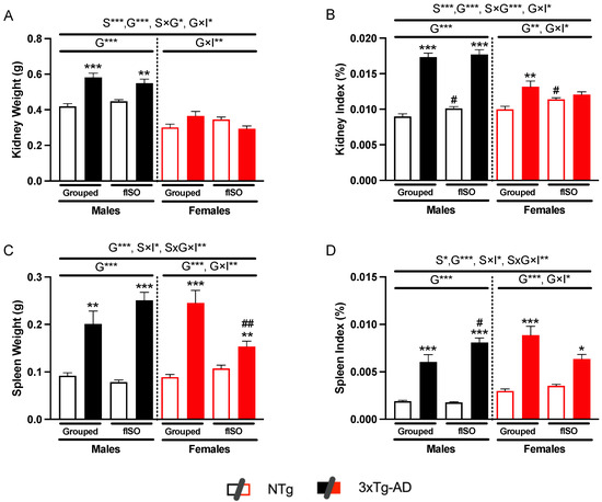 Physical status: kidney weights (A), kidney index (B), spleen weight (C), and spleen index (D). n = 5–10 mice per group, mean ± SEM. Sex: S*, p < 0.05; S***, p < 0.001. Genotype: G**, p < 0.01; G***, p < 0.001. Forced isolation: I***, p < 0.001. Interaction between sex and genotype: S × G*, p < 0.05; S × G***, p < 0.001. Interaction between genotype and isolation: G × I*, p < 0.05; G × I***, p < 0.001. Interaction between sex and isolation: S × I*, p < 0.05; S × I**, p < 0.01. Interaction between sex, genotype and isolation: S × G × I*, p < 0.05; S × G × I**, p < 0.01. Differences between two counterparts for genotype: * p < 0.05, ** p < 0.01, *** p < 0.001 vs. NTg counterpart; isolation: # p < 0.05, ## p < 0.01 vs. grouped counterpart.