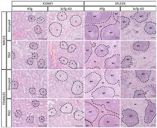 Histopathological assessment. Morphological comparison of kidney and spleen tissue in NTg and 3xTg-AD males and females for mice grouped and those submitted to forced isolation. H&E stained. Dashed lines indicate altered morphological features as follows: G, glomeruli; WP, white pulp; and RP, red pulp. The images were taken with ×20 and ×10 objective lenses; magnification bar = 100 μm.