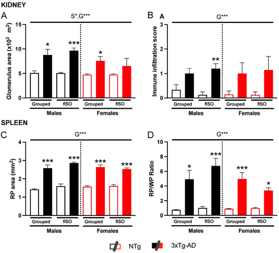 The kidney and spleen sections were prepared and stained for microscopic analysis to determine morphological and physiological alterations (Figure 2). The kidney showed a marked alteration of the glomeruli in the 3xTg-AD animals. In NTg animals, the glomeruli were round and small, but in 3xTg-AD, their size was considerably higher, and their round form was lost. Quantitative analysis of this alteration measuring the glomerular area showed a sex and genotype effect (Figure 3A; S, F (1,57) = 4.31, p = 0.042; G, F (1,57) = 28.9, p < 0.0001). 3xTg-AD animals had higher glomerular areas than NTg animals, and this effect was more marked in males than females. Another aspect taken into account was the immune infiltration. which had genotype differences (Figure 3B, F (1,57) = 19.16, p < 0.0001) that were significantly higher in 3xTg-AD animals. On the other hand, the spleen also presented structural changes in the red pulp; the typical microarchitecture of the spleen was lost when the red pulp enlarged and disintegrated, making it look clear and almost disappear. As for the spleen, the quantification of the red pulp area showed a clear genotype effect (Figure 3C; F (1,53) = 240.1, p < 0.001), with all 3xTg-AD animals showing wider red pulp areas. The ratio of the red pulp and white pulp in the spleen also showed this enlargement of the red pulp according to genotype (Figure 3D; F (1,53) = 59.12, p < 0.001); in the ratio, a tendency was also observed in isolated males to have higher RP/WP indexes, whereas isolated females showed a lower RP/WP index.