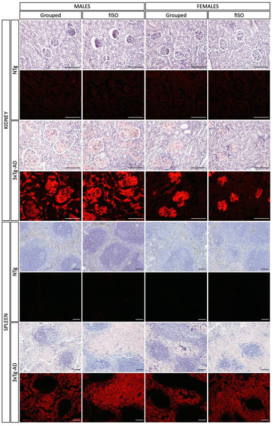 Deepening the histopathological analysis of the kidney and spleen, staining with Congo red was performed to determine amyloidosis (Figure 4). In the case of the kidney, the staining marked the kidneys of 3xTg-AD animals exclusively with that characteristic reddish color. In addition, fluorescence images showed a more highly stained area in males than in females; in any case, the affected area was always the glomeruli. In the spleen, the result was similar; only 3xTg-AD animals presented Congo red-stained areas, and in accordance with the H&E staining, the area affected was the red pulp. It can be seen in the bright field image that the red pulp has a reddish tone, and focusing on the fluorescent images, the red pulp clearly shows red fluorescence. Thus, 3xTg-AD animals presented amyloidosis in the kidney (glomeruli) and the spleen (red pulp).