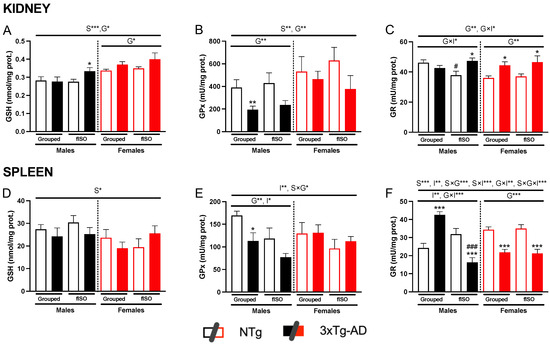 Oxidative stress in peripheral organs: kidney GSH levels (A), GPx activity (B), GR activity (C), spleen GSH levels (D), GPx activity (E), and GR activity (F). n = 5–10 mice per group, mean ± SEM. Sex: S*, p < 0.05; S**, p < 0.01; S***, p < 0.001. Genotype: G*, p < 0.05; G**, p < 0.01; G***, p < 0.001. Forced isolation: I*, p < 0.05; I**, p < 0.01. Interaction between sex and genotype: S × G*, p < 0.05; S × G***, p < 0.001. Interaction between genotype and isolation: G × I*, p < 0.05; G × I**, p < 0.01; G × I***, p < 0.001. Interaction between sex and isolation: S × I***, p < 0.001; S × I**, p < 0.01. Interaction between sex, genotype, and isolation: S × G × I***, p < 0.001. Differences between two counterparts for genotype: * p < 0.05, ** p < 0.01, *** p < 0.001 vs. NTg counterpart; isolation: # p < 0.05, ### p < 0.001 vs. grouped counterpart.