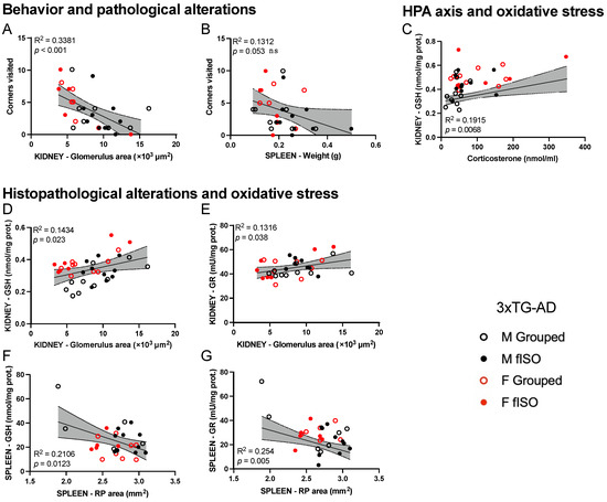 Correlation between the studied variables of the kidney and the spleen in 3xTg-AD animals. Correlations from behavior and histopathological alterations corresponding to the number of visited corners and glomerulus area (A) in the kidney and spleen weight (B) In the spleen, correlations between the HPA axis and oxidative stress corresponding to the levels of GSH in the kidney and serum levels of corticosterone (C). Correlations between the histopathological alterations and the oxidative stress corresponding to the glomerulus area in the kidney, the levels of GSH (D) and GR activity (E) and the red pulp (RP) area in the spleen, and levels of GSH (F) and GR activity (G).