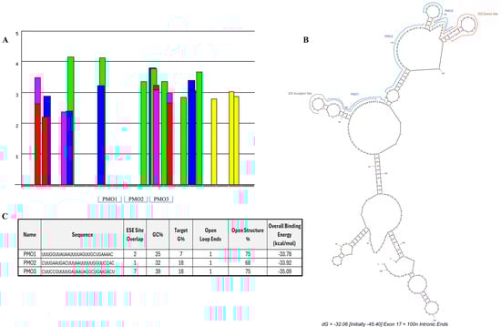 Designed antisense oligonucleotides for mPostn exon 17 skipping. SR protein-binding sites (A) were identified using ESEfinder [29]. SRSF1 (red), SRSF1 IgM-BRCA1 (pink), SRSF2 (blue), SRSF5 (green), and SRSF6 (yellow) sites were analysed at thresholds of 1.956, 1.867, 2.383, 2.67, and 2.676, respectively. (B) Lead PMO candidates and splice sites (ESEfinder) were mapped onto the mfold secondary structure prediction [30]. (C) Sequence and characteristics of each designed PMO.