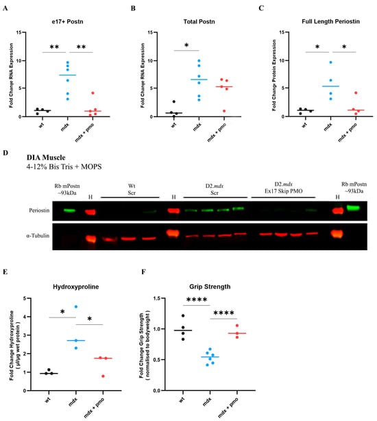 vivoPMO significantly reduced mPostn exon 17 expression and induced beneficial effect on muscles. RT-qPCR analysis of e17+ (A) and total (B) Postn mRNA expression represented as fold change compared to wild type (N = 4–6). (C) Full-length protein expression assessment using Western blot (D) analysis. (E) DIA hydroxyproline analysis (indicative of collagen level). (F) Forelimb grip strength was measured as the average of 5 discrete measurements of maximum force normalised to body weight. Outliers were identified via the ROUT method and omitted from the statistical analysis. The data were analysed by one-way ANOVA with Tukey post hoc tests and significance was recorded as * = p < 0.05; ** = p < 0.01; **** = p < 0.0001. Error bars = +/−SD; qPCR was performed in triplicate. Legend: ‘wt’ = Dba.2J wild type; ‘mdx’ = D2.mdx + Scramble vivoPMO; ‘mdx + pmo’ = D2.mdx + Postn exon 17 skipping vivoPMO.