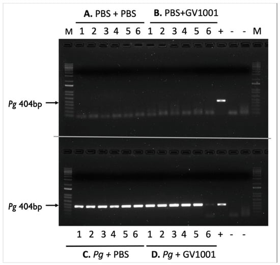 4.4. Preparation of PBS Containing 1% Methyl Cellulose, Culture of Pg and Topical Inoculation of PBS or Pg Directly into the Gingival Pocket, and the sc Injection of PBS or GV1001
