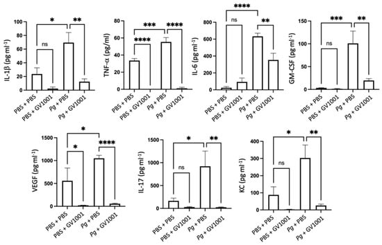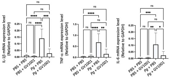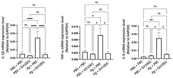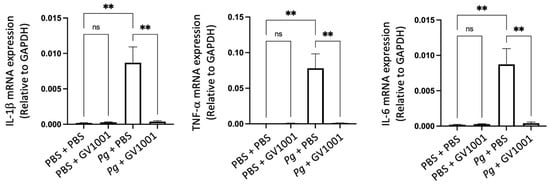 2.3. GV1001 Inhibited Pg-Induced Gingival Inflammation by Suppressing the Expression of Proinflammatory Cytokines in the Gingival Tissue