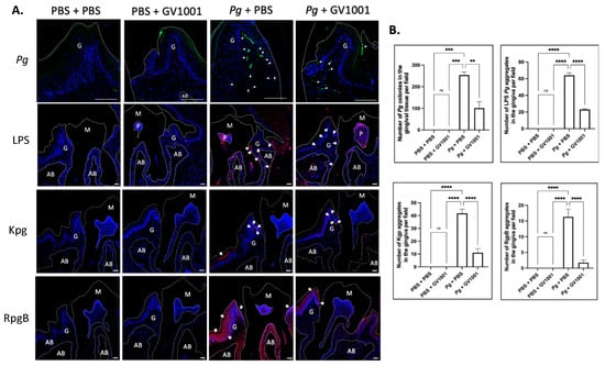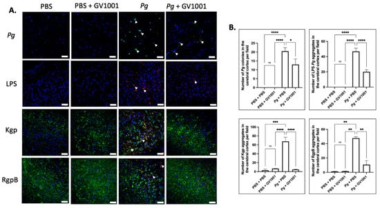 2.4. GV1001 Reduced the Number of Pg DNA Aggregates and the Aggregates of Pg LPS and Gingipains in the Gingival Tissues