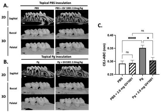 2.5. Systemic GV1001 Administration Significantly Inhibited the Alveolar Bone Loss Induced by Topical Pg Inoculation into the Gingival Pocket