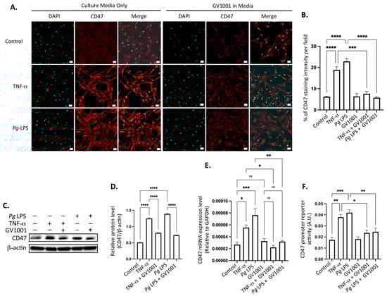 2.15. Pg-Induced Periodontal Disease Increased the Level of the Cluster of Differentiation 47 (CD47) in Atherosclerotic Plaques, and GV1001 Reversed the Increase