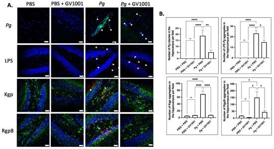 2.17. Pg-Induced Periodontal Disease Induced an Accumulation of Pg DNA, Pg LPS, and Gingipain Aggregates in the Cerebral Cortex and Hippocampus of Mice, Which Were Notably Reduced by Systemic GV1001