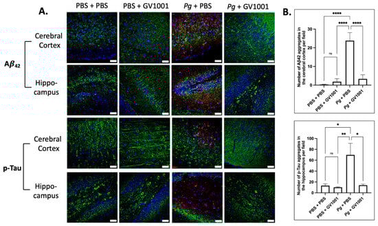 2.18. Pg-Induced Periodontal Disease Induced an Accumulation of A42 and p-Tau in the Brain, and GV1001 Notably Decreased the Accumulation