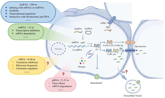 Diagram of the ncRNA–Cx axis. miRNAs act as translation suppressors by inhibiting transcription or inducing mRNA degradation. miRNAs bind to the 3′ untranslated regions of connexin mRNAs, preventing the Cx mRNAs from being translated, thereby contributing to disease development. lncRNAs, including circRNAs, act as sponges to abolish miRNA function, abrogating the miRNA-induced inhibition of Cx mRNAs. Moreover, miRNAs and lncRNAs interact with various proteins or serve as scaffolds to influence Cx function and distribution. tsRNAs and piRNAs regulate gene expression; however, how they regulate Cx remains unclear. Notably, (1) gap junctions particularly assembled from Cx43 provide pathways for the intercellular transport of miRNAs between cancer cells; (2) lncRNA CCRR’s reaction with CIP85 interrupts the binding of CIP85 and Cx43, thereby preventing the removal of Cx43 from the myocardial cell membrane; and (3) extracellular vesicles equipped with hemichannels have been implicated in the delivery of miRNAs to distant cells. However, supporting evidence for this mechanism is currently limited. The interaction between tsRNAs, piRNAs, and connexins needs to be further investigated. Cx, connexin; lncRNA, long noncoding RNA; circRNA, circular RNA; miRNA, microRNA; tsRNAs, transfer RNA (tRNA)-derived small RNAs; piRNAs, PIWI-interacting RNAs; nt, nucleotide; PPI, protein–protein interaction.