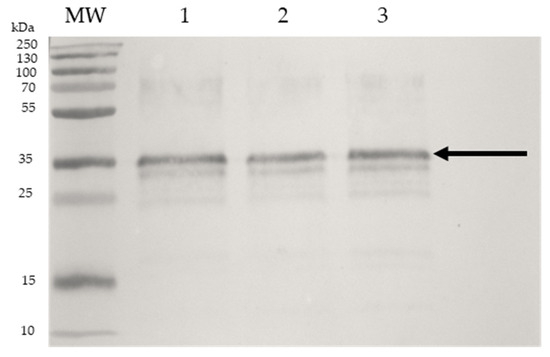 Western blot of different preparations of the UNAM-HIMFG polyvalent lysate. The WB was developed with polyvalent rabbit antibodies obtained against OmpA. Lines: 1, 2, and 3, samples of different preparations of polyvalent lysate. (Arrow indicates OmpA 35 kDa) MW Molecular Weight: Page Ruler Plus Protein Ladder pre-dye.