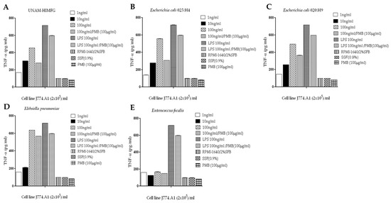 Secretion of TNF-α in J774 A.1 murine macrophages with different concentrations of the lysates. (A) UNAM-HIMFG, (B) E. coli O 25:H4, (C) E. coli O20:H9, (D) K. pneumoniae, and (E) E. faecalis. Results are the average of three tests performed in duplicate p ≤ 0.005. SSF: Physiological saline solution; PMB: polymyxin B 100 μg/μL; LPS: Lipopolysaccharide 100 ng/μL.