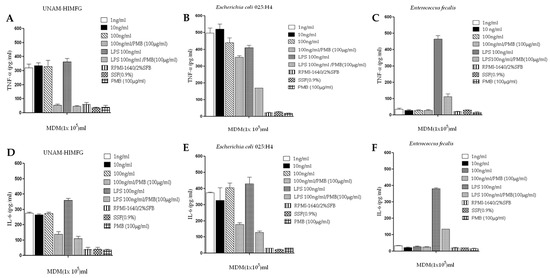 The activities of UNAM-HIMFG, E. coli O25:H4, and E. faecalis lysates were also analyzed on human macrophages. In this assay, it was identified that both UNAM-HIMFG and E. coli O25:H4 lysates activate TNF-α secretion, with no dose-dependent effect (Figure 6A,B), and again, E. faecalis lysate did not activate TNF-α secretion (Figure 6C). In this assay, the effect of polymyxin B on macrophage activation was also evaluated, this effect was 100% inhibited with UNAM-HIMFG lysate and 22% with E. coli O25:H4 lysate (Figure 6A,B). IL-6 production was also analyzed; the effect of both UNAM-HIMFG and E. coli O25:H4 was positive for the secretion of the cytokine (Figure 6D,E). As was previously observed, the stimulatory activity decreased by 50–60%, respectively (Figure 6D), after polymyxin B treatment. In a new finding, E. faecalis lysate showed no stimulatory activity (p ≤ 0.005) on IL-6 secretion (Figure 6F).