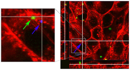 Localization of protealysin after incubation of Balb 3T3-SV40 fibroblasts with S. proteamaculans. Cytoskeleton was stained with rhodamine-phalloidin (red); bacteria were stained with FITC (green) and marked with green arrow; protealysin (marked with blue arrow) was stained with polyclonal rabbit anti-protealysin serum and the secondary Alexa647-conjugated antibody to rabbit IgG. The views on the left and below are projections of cells along the white lines. A higher magnification of the area enclosed by the gray frame is shown on the left. Modified from [14].