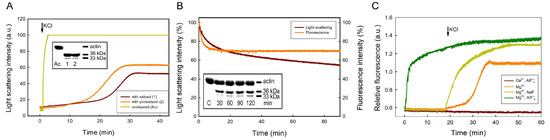 (A) Polymerization of the protealysin cleaved G-actins. Ca-G-actin was cleaved with protealysin of bacterial extracts of recombinant E. coli expressing the protealysin (1) and purified protealysin (2). Ac, nondigested actin (insert). Cleaved Ca-G-actin was transformed into Mg-G-actin and polymerized with 0.1 M KCl (arrow). (B) Effects of proteolysis on F-actin polymerization status. At time zero, the lysate of recombinant E. coli expressing the protealysin was added to Mg-F-actin. F-actin cleavage was monitored by SDS/PAGE (insert). Control, nondigested actin. (C) Effects of aluminum and sodium fluoride on polymerization of the protealysin cleaved actin. Protealysin-cleaved Ca-G-actin was transformed into Mg-G-actin. At time zero, Ca- and Mg-actins were either complemented with 1 mM AlF4− (Ca2+, AlF4− and Mg2+, AlF4−, respectively) followed by the addition of 0.1 M KCl (arrow) or directly polymerized with 0.1 M KCl in the absence (Mg2+) or presence of 5 mM NaF (Mg2+, NaF). All panels are modified from [14,37].