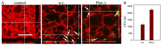 Invasion of M-HeLa cells by S. proteamaculans (w.t.) and S. proteamaculans Pln(-) containing the inactivated protealysin gene. (A) Confocal microscopy images of M-HeLa cells incubated with bacteria. Cytoskeleton was stained with rhodamine phalloidin (red); bacteria (arrows) were stained with FITC (green). The views on the right and bottom are projections of cells along the white lines. Bar, 30 μm. (B) Quantitative evaluation of the susceptibility of M-HeLa cells to invasion. Modified from [41].