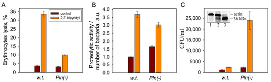 Effects of iron-depletion on the activity of the bacterial virulence factors of S. proteamaculans (w.t.) and S. proteamaculans Pln(-) with an inactivated protealysin gene. The effect of 2,2′-bipyridyl in the growth medium on the hemolytic activity characterizing activity of ShlA toxin (A), the activity of extracellular metalloprotease serralysin (B) and the intensity of invasion (C). The insert shows the actin-hydrolyzing activity in the extracts of S. proteamaculans (w.t.) grown in the absence (lane 2) or presence (lane 3) of 2,2′-bipyridyl. Control actin (lane 1). Modified from [41].