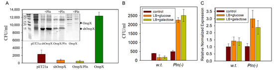 (A) Effects of recombinant truncated OmpX accumulation in E. coli on the adhesion to the host cell surface. Quantitative evaluation of the adhesion to M-HeLa cells of bacteria E. coli (pET21a), E. coli (shOmpX), synthesizing truncated OmpX, E. coli (OmpX/Pln), synthesizing both full-length OmpX and protealysin, E. coli (OmpX), synthesizing full-length OmpX. The insert shows the membrane fractions of E. coli bacteria containing recombinant truncated and full-length OmpX, before and after incubation with purified protealysin. (B) Invasion of 3T3-SV40 cells by S. proteamaculans (w.t.) and S. proteamaculans Pln(-) grown in LB medium in the absence and presence of glucose or galactose. (C) Expression of OmpX in bacteria grown in LB medium in the absence and presence of glucose or galactose. All panels are modified from [41].