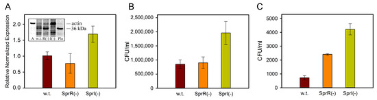 S. proteamaculans synthesize active protealysin during the stationary growth phase, when the bacterial population density is maximal [12]. In response to changes in population density, gene expression, including virulence factors, is regulated by the Quorum Sensing system (QS). S. proteamaculans have a LuxI/LuxR type QS system consisting of the AHL synthase SprI and the regulatory receptor protein SprR [81]. In the classical model of the QS system, binding to AHL stabilizes LuxR-type proteins, allowing them to bind DNA and activate transcription of target genes, including the AHL synthase gene [82]. However, the S. proteamaculans QS system differs from the classical QS system in that the sprI AHL synthase gene and the sprR receptor protein gene are convergently transcribed and overlap in their terminal regions [81], making AHL synthase independent of the SprR protein [83]. Accordingly, only a mutation in the AHL synthase sprI gene, but not a mutation in the sprR receptor gene, led to a decrease in exoprotease and chitinolytic activity and the ability of S. proteamaculans to form biofilms [83]. Likewise, the activity of protealysin is affected only by inactivation of the sprI AHL synthase gene, but not by inactivation of the sprR receptor gene [84,85] (Figure 6A, insert). Inactivation of the sprI AHL synthase gene led to a decrease in protealysin activity and an increase in the expression of the surface protein OmpX, which led to increased adhesion of these bacteria, but not bacteria with an inactivated sprR receptor gene [84,85] (Figure 6A,B). Increased bacterial adhesion led to an increase in the intensity of S. proteamaculans invasion as a result of inactivation of the sprI AHL synthase gene [84] (Figure 6C). These results suggest that synthesis of AHLs controls the invasion of S. proteamaculans by accumulation on the bacterial surface of full-length OmpX not cleaved by protealysin [84].