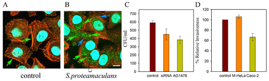Distribution of EGFR in M-HeLa cells before (A) and after (B) incubation with S. proteamaculans. Cytoskeleton was stained with rhodamine-phalloidin (red); EGFR (green) was stained with antibodies and the secondary Alexa488-conjugated antibody to rabbit IgG; and DNA (blue turquoise) was stained with DAPI. Bacteria (blue turquoise) are indicated with a blue arrow based on the blue channel image. EGFR is indicated with a green arrow. Scale bar: 10 µm. Modified from [87]. (C) Effect of treating M-HeLa cells with siRNA targeting EGFR and inhibitor of EGFR phosphorylation (tyrphostin AG 1478) on cell sensitivity to S. proteamaculans invasion. (D) Effect of transfection of M-HeLa and Caco-2 cells with siRNA targeting E-cadherin on cell sensitivity to S. proteamaculans invasion. Control—intensity of invasion into cells transfected with siRNA containing scrambled nucleotide sequence. The number of intracellular bacteria was estimated as a percentage, taking the number of intracellular bacteria in control samples as 100%. Modified from [89].