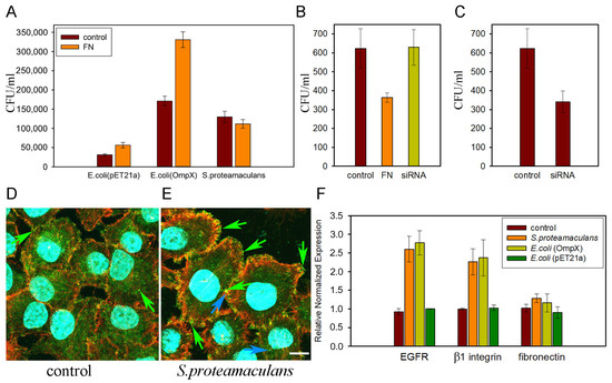 (A) Adhesion of E. coli (pET21a; control), E. coli (OmpX) synthesizing OmpX and S. proteamaculans to fibronectin. (B) The effect of treating of S. proteamaculans with fibronectin and M-HeLa cells with siRNA targeting fibronectin on the intensity of bacterial invasion. Control, bacterial invasion of cells without treatment. (C) Effect of treating M-HeLa cells with siRNA targeting β1 integrin on cell sensitivity to S. proteamaculans invasion. Control—M-HeLa cells transfected with siRNA containing scrambled nucleotide sequence. (D,E) Distribution of β1 integrin in M-HeLa cells before (D) and after (E) incubation with S. proteamaculans. Cytoskeleton was stained with rhodamine-phalloidin (red); β1 integrin (green) was stained with antibodies and the secondary Alexa488-conjugated antibody to mouse IgG; and DNA (blue turquoise) was stained with DAPI. Bacteria (blue turquoise) are indicated with a blue arrow based on the blue channel image. β1 integrin is indicated with a green arrow. Scale bar: 10 µm. (F) Effect of bacterial infection on expression levels of EGFR, β1 integrin and fibronectin in the host cell. Control—uninfected M-HeLa cells. All panels are modified from [87].