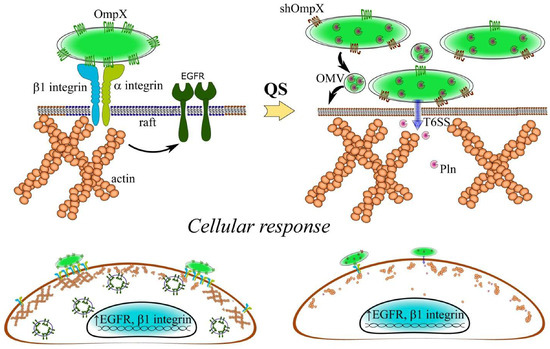 Scheme of interaction between S. proteamaculans and host cell. By contacting host cell receptors, the bacterial surface protein OmpX (top left) increases adhesion and causes increased expression of EGFR and β1 integrin (bottom). Infection with bacteria leads to the formation of EGFR-containing endosomes and accumulation of β1 integrin on the surface of human cells (bottom left). When the bacterial population density increases (arrow), the bacterial QS system activates the protease protealysin, which cleaves de novo-synthesized OmpX to form a truncated shOmpX (top right). The truncated shOmpX is not involved in bacterial adhesion. On the other hand, protealysin enters the host cell via the type VI secretion system (T6SS) and/or bacterial outer membrane vesicles (OMVs) (top right). By cleaving actin in the host cell, protealysin can mediate actin rearrangement necessary for bacterial invasion (bottom right).