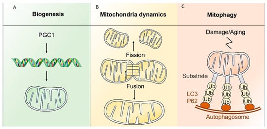 Quality control mechanism in mitochondria. Figure legend: (A) Biogenesis: activation of peroxisome proliferator-activated receptor-γ coactivator-1α (PGC1) due to stress factors, then activation of mt DNA transcription leading to formation of new mitochondria. (B) Mitochondria dynamic: fission of a mitochondrion resulting in two separate mitochondria. Fusion: Two mitochondria fusion at the outer and inner membrane interfaces. This process allows for exchange of mtDNA, proteins, or metabolites and improves overall mitochondria respiratory function and efficiency. (C) Mitophagy: degradation of the mitochondria with the ubiquitin pathway into the phagosome.