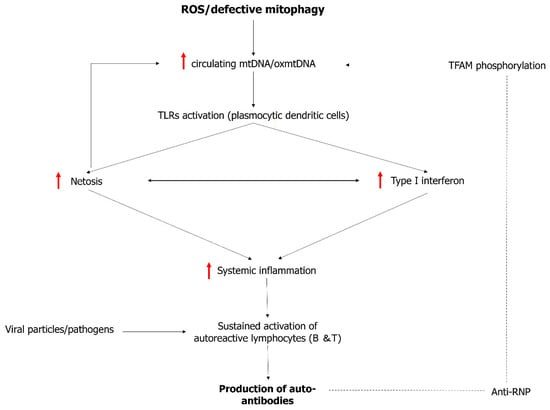Interplay between mitochondrial dysregulation and inflammation in systemic lupus erythematosus. Red arrow = increase.