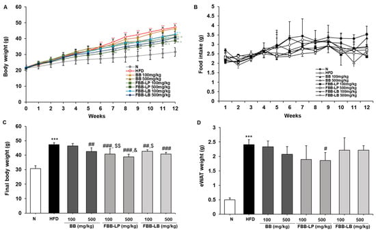The initial body weight was not significantly different between groups. During the four weeks of the experiment, the HFD group showed a significant increase in body weight compared to the N group. After 12 weeks, the final body weight of the HFD group increased to 47.23 ± 1.43 g, which is about 1.5 times that of the N group, while the fermented blackberries administration group had a relatively low increase in body weight (Figure 3A,C). In particular, we showed that the treatment of fermented blackberries by L. plantarum (FBB-LP) significantly reduced body weight compared with the blackberries (BB)-treated group. The epididymal white adipose tissue (eWAT) weight also significantly increased in the HFD group compared to the N group after 12 weeks, but the FBB-LP group showed a decrease in eWAT weight (Figure 3D).