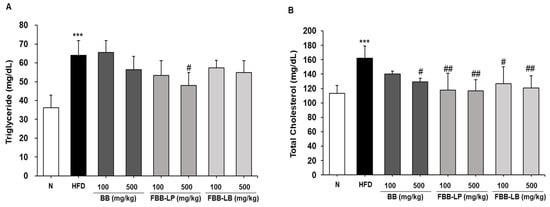 Effects of fermented blackberries on serum lipids of HFD-induced obesity mice. (A) TG and (B) TC levels. All values represent the mean ± SD. Data were analyzed using Turkey’s multiple comparison test. *** p < 0.001, versus the N group; # p < 0.05 and ## p < 0.01, versus the HFD groups. HFD, high-fat diet; TG, triglyceride; TC, total cholesterol; BB, blackberries; FBB-LP, blackberries fermented by fermented by L. plantarum JBMI F5; FBB-LB, blackberries fermented by L. brevis CBG-C24; HFD, high-fat diet; N, normal.