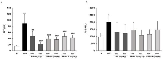 Effects of fermented blackberries on liver toxicity in HFD-induced obesity mice. (A) ALT and (B) AST levels in HFD-induced obesity mice serum. All values represent the mean ± SD. Data were analyzed using Turkey’s multiple comparison test. * p < 0.05 and *** p < 0.001, versus the N group; ## p < 0.01 and ### p < 0.001, versus the HFD group; BB, blackberries; FBB-LP, blackberries fermented by L. plantarum JBMI F5; FBB-LB, blackberries fermented by L. brevis CBG-C24; HFD, high-fat diet; ALT, alanine aminotransferase; AST, aspartate aminotransferase; N, normal.