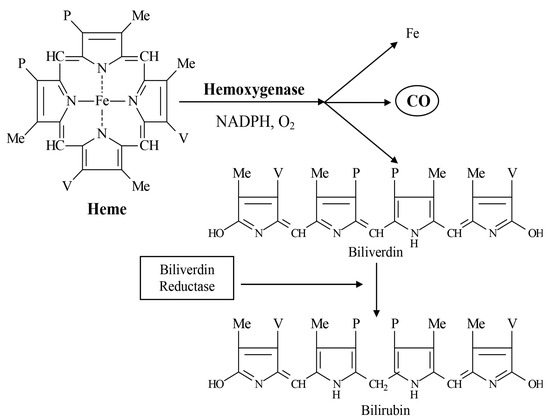 - Haines, D.D.; Tosaki, A. Heme Degradation in Pathophysiology of and Countermeasures to Inflammation-Associated Disease. Int. J. Mol. Sci. 2020, 21, 9698. [Google Scholar] [CrossRef]