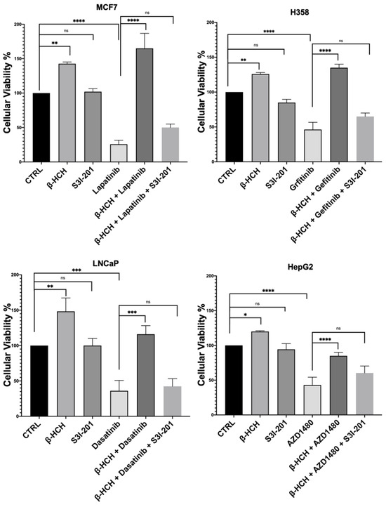CCK-8 assay performed on MCF-7, H358, LNCaP, and HepG2. Cells were incubated with 10 µM of β-HCH, TKIs, and S3I-201, as shown in Figure 2. Cellular viability decreased after treatment with β-HCH + TKIs + S3I-201 compared with samples treated only with β-HCH + TKIs. The values reported in the histograms represent the averages of three independent experiments and are presented as the means and standard deviation. Statistical analysis was performed with the GraphPad Prisma software using ANOVA followed by Tukey’s post hoc test. Statistically significant differences referring to the CTRL or TKIs are marked with asterisks (ns: not statistically significant, * p < 0.05; ** p < 0.01; *** p < 0.001; **** p < 0.0001).