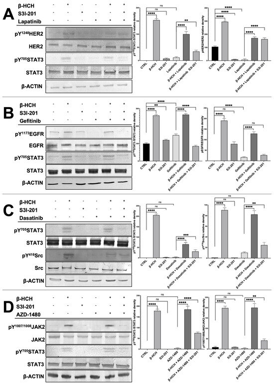 Immunoblotting evaluating the activation of STAT3 and HER2 in MCF-7 (A), STAT3 and EGFR in H358 (B), STAT3 and SRC in LNCAP (C), and STAT3 and JACK2 in HepG2 (D). Total protein extracts were subjected to immunoblot analysis. Immunoblot evidenced that STAT3 phosphorylation (pY705-STAT3), HER2 phosphorylation (pY1248-HER2), JACK2 phosphorylation (pY1007/1008-JAK2), and Src phosphorylation (pY416-Src) increased upon treatment with 10 µM of β-HCH. The increase in STAT3 phosphorylation was upheld even with the combined treatment β-HCH+ TKIs, whereas a decrease in the band intensity occurred in the sample with triple treatment (β-HCH+ TKI+ S3I-201), as evident in the relative densitometry. β-actin was used for housekeeping. Phosphorylation levels referred to the amount of total STAT3, HER2, EGFR, Src, or JAK2 present in each sample and were compared with the control. These images are representative of three independent experiments with similar results. Statistical analysis was performed with the GraphPad Prisma software using ANOVA followed by Tukey’s post hoc test. Statistically significant differences referring to the CTRL or TKIs are marked with asterisks (ns: not statistically significant, ** p < 0.01; *** p < 0.001; **** p < 0.0001).