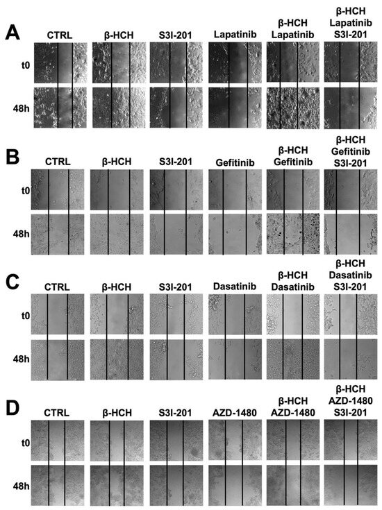 Wound-healing assay conducted on MCF-7 (A), H358 (B), LNCaP (C), and HePG2 (D) cell lines. Images were collected immediately after scratching the cell monolayer (T0) and 48 h post-treatment with TKIs. The results show that after 48 h of incubation with specific TKIs +10 µM of β-HCH, the pollutant affected the drug efficacy. Conversely, in the triple treatment (β-HCH+ TKI+ S3I-201), by inhibiting the STAT3 protein, there was a reduction in the cellular migratory capability. These images, representative of three independent experiments with similar results, were captured with a Leica AF6000 Modular System microscope.