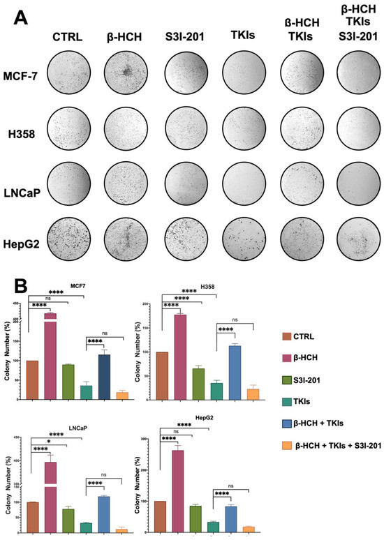 Clonogenic assay conducted on MCF-7, H358, LNCaP, and HepG2 cell lines. β-HCH induced an increase in colony formation, and in the triple treatment (β-HCH+ TKI+ S3I-201), by inhibiting the STAT3 protein, there was a reduction in cellular colony formation. The cells were pretreated with 10 µM of β-HCH in flasks for 7 days and then seeded at a density of 500 cells/mL in 6-well plates and cotreated for 5 days with specific TKIs, as shown in Figure 2. After treatments, the colonies formed were evidenced using crystal violet dye (Panel A) and counted, and the total areas of colonies (expressed as percentages with respect to the control and SD) are shown in the histogram (Panel B). These images are representative of three independent experiments with similar results. Statistical analysis was performed with the GraphPad Prisma software using ANOVA followed by Tukey’s post hoc test. Statistically significant differences were determined at * p < 0.05; and **** p < 0.0001, ns: not statistically significant.
