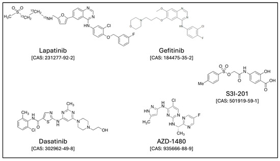 The human breast cancer cell line MCF-7, human bronchoalveolar cancer cell line H358, human prostate cancer cell line LNCaP, and human hepatoma cell line HepG2 were obtained from the American Type Culture Collection (ATCC, Manassas, VA, USA). The cells were cultured until approximately 70% to 90% confluent, in a 95% air/5% CO2 humidified atmosphere using a proper culture medium, RPMI 1640 (Sigma-Aldrich, Milan, Italy, Cat. No. R0883) or DMEM-LG (Sigma-Aldrich, Milan, Italy, Cat. No. D5546), supplemented with 1% sodium pyruvate, 10% fetal bovine serum, 2 mM glutamine, 100 μg/mL streptomycin, and 100 U/mL penicillin. All four cell lines were treated with β-hexachlorocyclohexane (β-HCH) (Sigma-Aldrich, Milan Italy, Cat. No. 33376), with a final concentration of 10 μM. For the experiments, the following inhibitors (Figure 8) were used at the specified concentrations: 0.8 μM lapatinib (Sigma-Aldrich, Milan, Italy, Cat. No. CDS022971), 15 µM gefitinib (Sigma-Aldrich, SLM1657), 70 nM dasatinib (Selleckchem, Roma, Italy, Cat. No. S1021), 6 μM AZD1480 (Sigma-Aldrich, Milan, Italy, Cat. No. SML1505), and 100 μM S3I-201 (Sigma-Aldrich, Milan, Italy, Cat. No. SML0330).