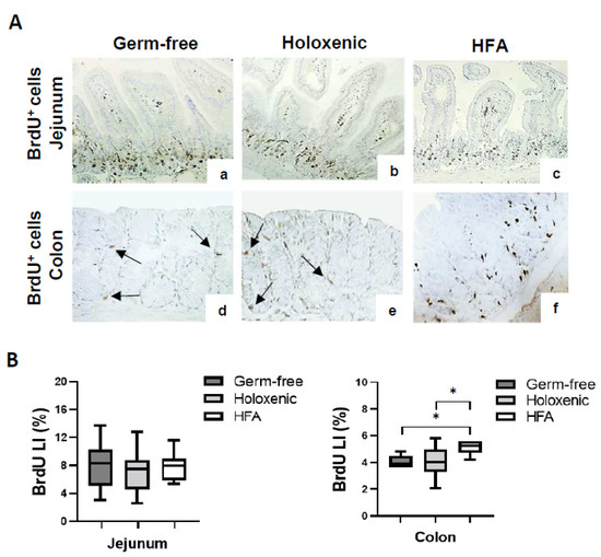 2.1. Intestinal Cell Proliferation in Germ-Free, Holoxenic, and HFA Mice