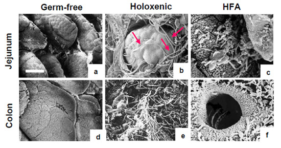 2.2. Bacteria Distribution along the Intestine of Germ-Free, Holoxenic, and HFA Mice