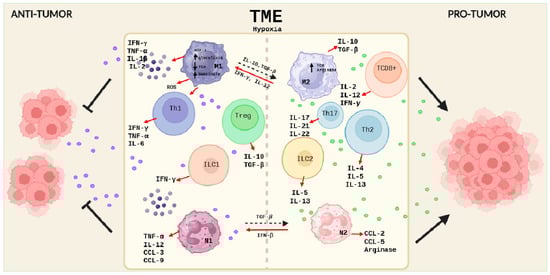 Schematic description of the cellular components of the immune system in the TME of colorectal cancer. On the (left), the cells of the immune system and their secreted products involved in the antitumor response are represented, and, on the (right), the cells and molecules involved in a pro-tumor response are represented. Created with BioRender.com.