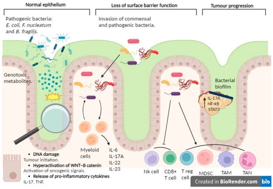 Involvement of the microbiome in CRC. The involvement of the microbiome in colorectal cancer becomes apparent through the capacity of specific pathogenic bacteria, such as Escherichia coli, Fusobacterium nucleatum, and Bacteroides fragilis, alongside their metabolites, to incite tumorigenesis. This initiation may ensue through direct mutagenic impacts on intestinal epithelial cells and the triggering of intracellular signaling pathways associated with oncogenesis, notably the hyperactivation of the WNT–β-catenin pathway. Furthermore, bacterial metabolites may provoke inflammatory responses by releasing factors like TNF and IL-17, thereby exacerbating tumor formation. Diminished intestinal barrier function may facilitate bacterial invasion from the intestinal lumen, prompting an inflammatory response that fosters tumor growth. These bacteria can form biofilms around the tumor, activating inflammatory signaling pathways (involving factors like NF-κB, STAT3, and the IL-17A receptor) that promote CRC development. Moreover, these bacterial entities exhibit the ability to quell immune responses within the TME through the recruitment of immunosuppressive cell populations, including myeloid-derived suppressor cells (MDSCs) and regulatory T cells (Tregs). Additionally, they orchestrate the polarization of immune cells towards phenotypes conducive to tumor expansion and immune dampening, typified by tumor-associated macrophages (TAMs) and tumor-associated neutrophils (TANs). Created with BioRender.com.