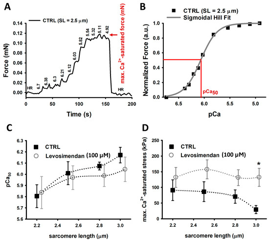 Ca2+ sensitivity and maximum Ca2+-saturated force recordings. (A), Representative force–pCa recording of a CTRL single muscle fibre at 2.5 µm SL. (B), by plotting the steady-state force levels against their respective pCa value, a Hill fit’s inflection point represents the pCa50 value. Parameters: b (Hill coefficient) = 2.118 and c = 8.385 × 10−7 with —log10(c) = 6.07 = pCa50. (C), Ca2+ sensitivity recordings yield a gradually increasing pCa50 value in agreement with LDA. Both groups display a similar Ca2+ sensitivity. (D), Maximum Ca2+-saturated force is slightly enhanced in single fibres exposed to 100 µM levosimendan vs. control fibres for SLs from 2.2 µm to 2.8 µm. At 3.0 µm SL, single fibres in levosimendan-enriched solution produce significantly more force than untreated fibres. The latter reproduced a force decline in agreement with the descending limb of LDA. Data points were slightly shifted around each other at same SL for visualisation purposes only. The dotted curves connecting the data visualize potential trends but do not explicitly result from any fit procedure. Error bars represent standard error. n: 3–9, valid for both panels and study conditions. * p ≤ 0.05.