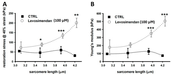 Stress–strain relationships were assessed to determine the maximum restoration stress at 140% elongation (40% strain). Maximum restoration stress and the Young’s modulus of untreated fibres slowly but gradually increased with greater SL, according to the passive behaviour of LDA, except for very large SLs of 4.2 µm (Figure 2A,B). This increase was more pronounced in single fibres stretched in a levosimendan-supplemented solution. They seem to display a somewhat exponential increase in maximum restoration stress and Young’s modulus with significantly larger values, particularly at SLs beyond 3.8 µm. As such, single EDL fibres appear to be stiffer in the presence of levosimendan.