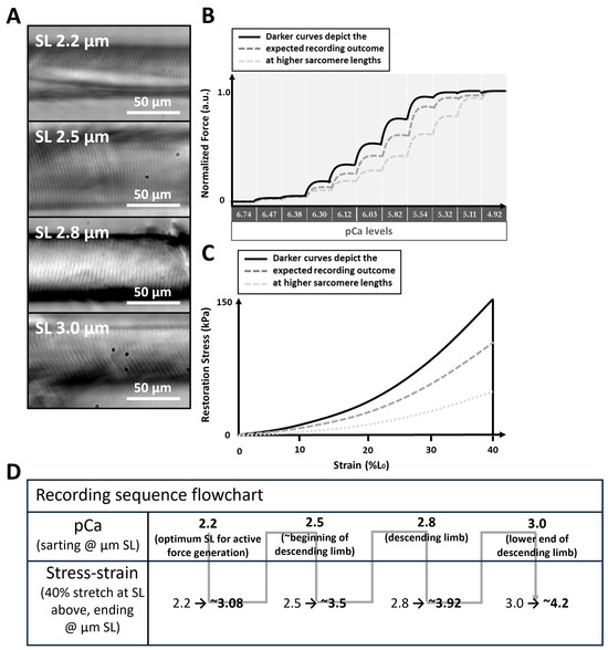 To study LDA, the sarcomere length (SL) must be precisely controlled; for this purpose, the MyoRobot’s integrated optics system was used. Initially, SL was adjusted to 2.2 µm (considered as the optimum SL overlap in active LDA [54]) by driving the VC at 1 µm/s to elongate the fibre (Figure 3A). Once reached, the fibre was subjected to a force–pCa recording (active biomechanics, Figure 3B) and a stress–strain relationship recording (passive biomechanics, Figure 3C). Subsequently, the same single fibre was stretched to 2.5 µm SL (considered as the beginning of the descending limb [41]), and the procedure repeated until an SL of 3.0 µm (considered as end of the descending limb of active LDA [41]) was reached. In case of fibre rupture, which may occur when the fibre is stretched beyond 4.0 µm SL due to titin disintegration [55], the fibre was excluded from analysis and the process was re-initiated at 2.0 µm SL with a new muscle fibre. A single experiment day either investigated muscle fibre exposed to bioactive solutions without or with levosimendan, meaning that experiments with or without levosimendan took place at different days with different single muscle fibres (unpaired data). The recording sequence carried out on each respective day is displayed in Figure 3D. This design allowed us to conduct a complete pCa–force recording followed by a stress–strain recording on the same single fibre covering four distinct sarcomere lengths before moving to the next single fibre. This allowed for self-control experiments that consider the parameter ‘sarcomere length’.