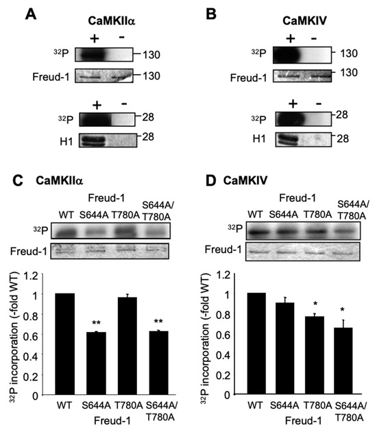We addressed whether purified recombinant human Freud-1 is a direct substrate for CaMKIIα or CaMKIV using in vitro protein kinase assays (Figure 1A,B). In the presence of either activated CaMKIIα or CaMIV, a strong [32P]-labeled species corresponding to the full-length human Freud-1 (≈120 kDa) was observed, while in the absence of CaMK, no [32P] incorporation was observed. As a positive control, the Histone-H1 phosphorylation by CaMK was also observed. These results provide evidence that Freud-1 is a direct substrate of CaMKIIα and CaMKIV.
