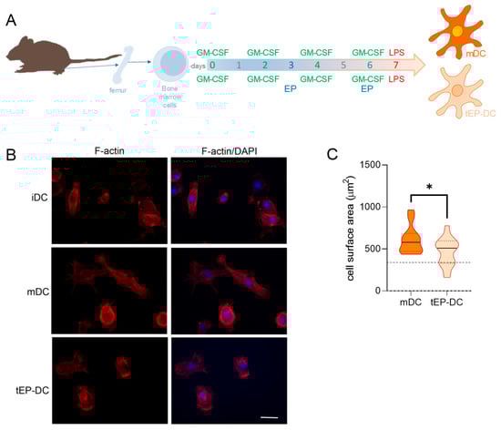 Effects of EP on morphological characteristics of DCs. BMDCs were obtained from C57BL/6 mice and differentiated towards DCs in the presence of GM-CSF (20 ng/mL). Cells were stimulated with LPS (100 ng/mL) for 4 h without previous EP treatment (mDCs) or previously treated with 3.1 mM EP (tEP-DCs) (A). Immunocytochemistry was used to stain actin filaments with phalloidin (red) and with DAPI nuclear stain to visualize the nuclei (blue). Representative micrographs are shown. The scale bar is 20 µm (white line) (B). The results obtained in two experiments are presented as a violin plot (n = 12); the dashed line represents the level obtained in iDCs (C). * p < 0.05, t-test.