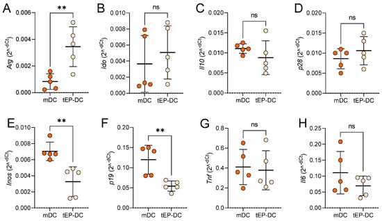 Relative mRNA levels of inflammation-related genes in DCs. BMDCs were obtained from C57BL/6 mice and differentiated towards DCs in the presence of GM-CSF (20 ng/mL). Cells were stimulated with LPS (100 ng/mL) for 2 h without previous EP treatment (mDCs) or previously treated with 3.1 mM EP (tEP-DCs). Relative mRNA expression of Arg (A), Ido (B), Il10 (C), p28 (D), Inos (E), p19 (F), Tnf (G), and Il6 (H) was determined in DCs by RT-PCR. Data are presented as individual values and as mean +/− SD, n = 5. ** p < 0.01, t-test.
