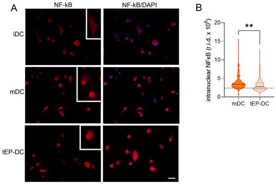 Effect of EP on NF-κB activation in DCs. BMDCs were obtained from C57BL/6 mice and differentiated towards DCs in the presence of GM-CSF (20 ng/mL). Cells were stimulated with LPS (100 ng/mL) for 1 h without previous EP treatment (mDCs) or previously treated with 3.1 mM EP (tEP-DCs). Immunocytochemistry was used to stain cells with an antibody against NF-κB (red) and with DAPI nuclear stain to visualize the nucleus (blue). Representative micrographs with insets (twice enlarged) are shown (A). The scale bar is 20 µm (white line). The results obtained in two experiments are presented as a violin plot (n = 150); the dashed line represents the level obtained in iDCs (B). r.i.d.—raw integrated density; ** p < 0.01, t-test.